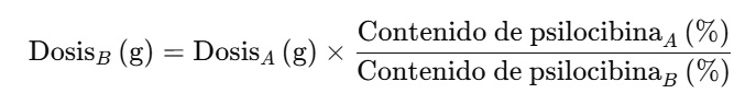Si ya has establecido una microdosis a partir de una variedad distinta a Golden Teacher y necesitas el equivalente en cualquier otra variedad, la fórmula sigue siendo la misma, incorporando el contenido de psilocibina de ambas cepas (tabla al final):