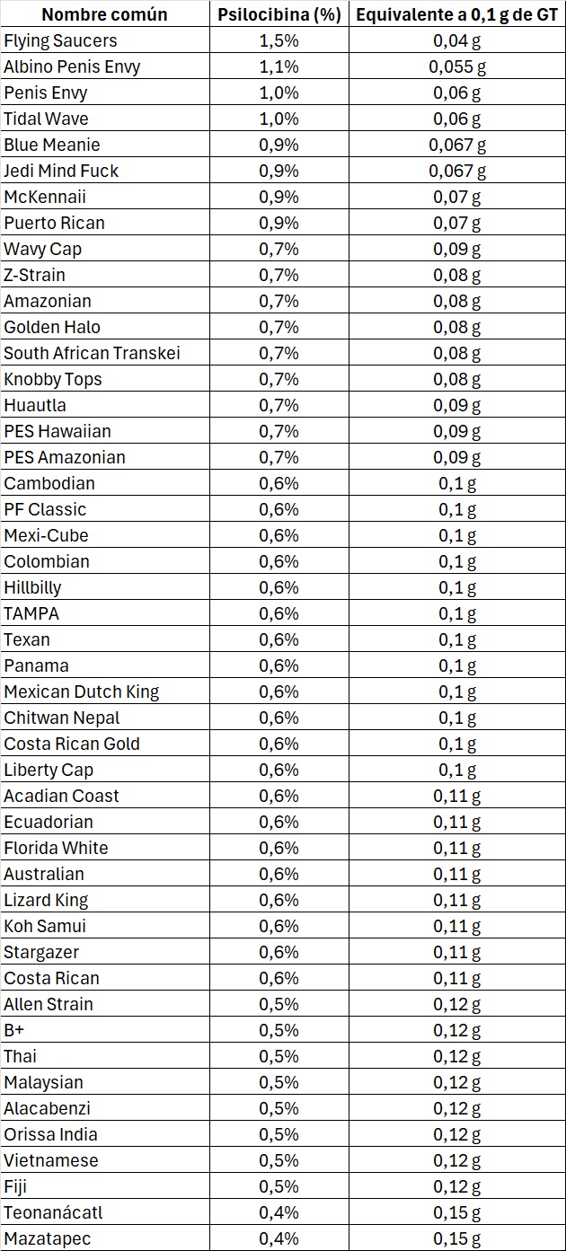 - Es decir, 1 g seco ≈ 6 mg de psilocibina.