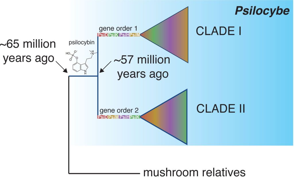 Los estudios han establecido que la psilocibina se sintetizó por primera vez en hongos del género Psilocybe a través de 4 o 5 posibles transferencias horizontales de genes en un período de entre 9 y 40 millones de años atrás.